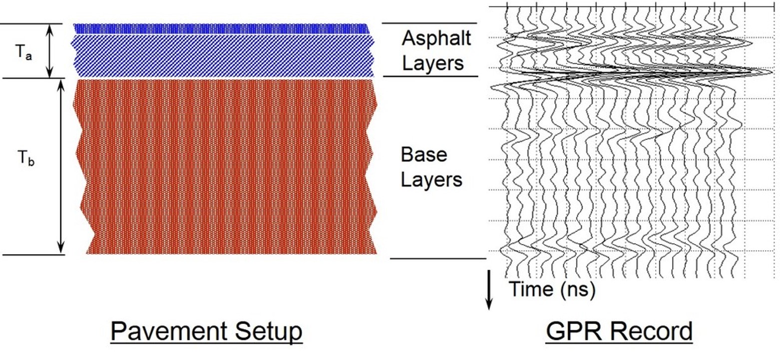 Ground penetrating radar operates by transmitting short pulses of electromagnetic energy into the pavement using an antenna attached to a survey vehicle. These pulses are reflected back to the antenna with an arrival time and amplitude that is related to the location and nature of dielectric discontinuities in the material (air/asphalt or asphalt/concrete, reinforcing steel, etc). The reflected energy is captured and may be displayed on an oscilloscope to form a series of pulses that are referred to as the radar waveform. The waveform contains a record of the properties and thicknesses of the layers within the pavement.